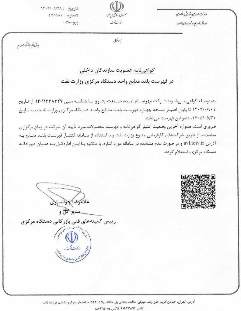 شرکت مهرسام صنعت دارای کادری مجرب در زمینه محاسبات مقاومت برج ، طراحی و تولید انواع برجهای روشنایی میباشد ، همچنین شرکت مهرسام صنعت دارای گواهی عضویت در بخش تولیدات پایه لیست بلند شرکت نفت ،گاز و پتروشیمی میباشد.